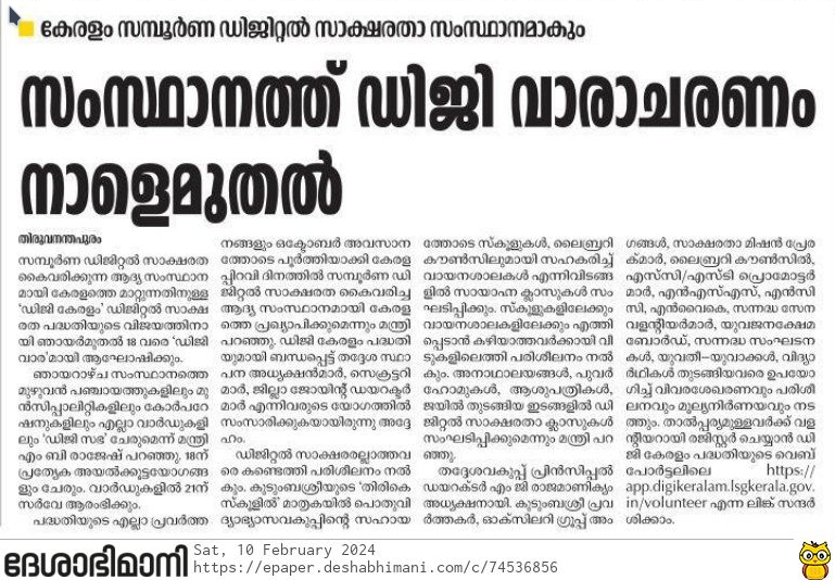 > തിരുവനന്തപുരം കോർപറേഷനിൽ പദ്ധതിയുടെ ആദ്യഘട്ടത്തിന് തുടക്കമാകും. സർക്കാർ ജീവനക്കാർ, കോളേജ് വിദ്യാർത്ഥികൾ, പൊതുരംഗത്തു വിവിധ മേഖലകളിൽ പ്രവർത്തിക്കുന്നവർ എന്നിങ്ങനെ എല്ലാവർക്കും ഇതിൽ ഭാഗമാകാം. ഈ പദ്ധതിയിൽ പ്രമുഖ പരിശീലകരായി പങ്കെടുത്തു വിജയകരമായി പരിശീലനം പൂർത്തിയാക്കുന്നവർക്ക് ഐ.ടി മിഷനും സാക്ഷരത മിഷനും സംയുക്തമായി പ്രശംസാപത്രം നൽകുന്നതാണ്. വിശദ വിവരങ്ങൾക്ക് വെബ്സൈറ്റ് സന്ദർശിക്കുക: <https://itmission.kerala.gov.in/ml/node/429>